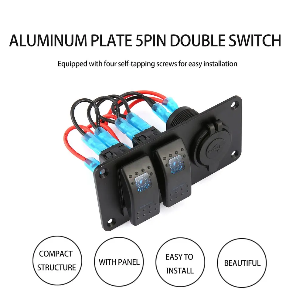 2 Gang Car Marine Boat 5 Pin LED Rocker Switch Panel Breaker 3.1A Dual USB Ports Socket Charger Wat